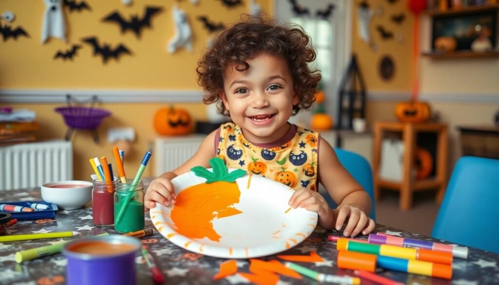 - Paper Plate Pumpkins: Use orange paper plates and black markers to transform them into jack-o’-lanterns. Toddlers can cut shapes for eyes and mouths, enhancing fine motor skills.
